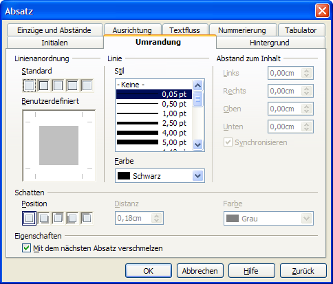 Öffnen Sie den Menüpunkt Format – Absatz Umrandung, legen Linienanordnung,