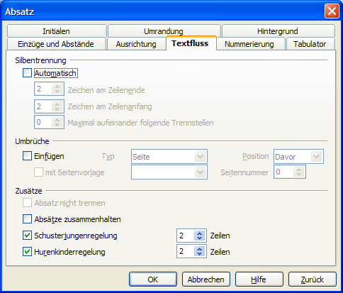 · Schusterjungenregelung gibt die Anzahl der Zeilen vor, die mindestens am Ende der Seite stehen bleiben müssen. Fehlt dafür der Platz, so wandert der gesamte Absatz auf die nächste Seite.