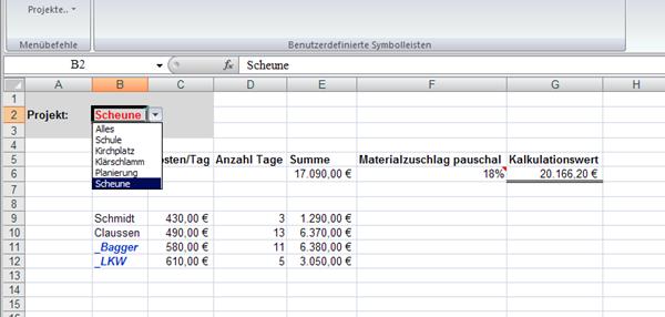 Der Befehl Projekt.. ..Kalkulieren öffnet ein Tabellenblatt ‚Kalkulation’.
