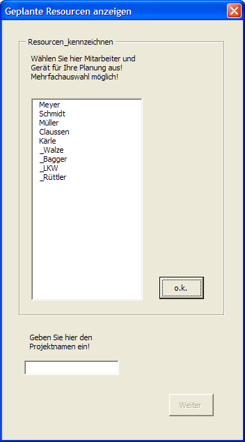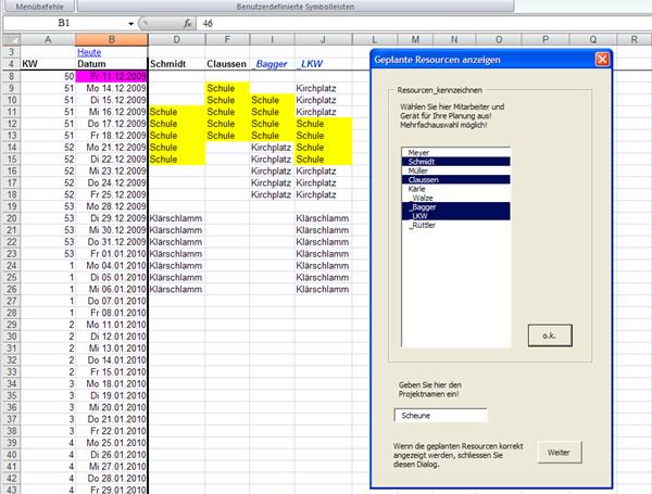 Mit der Maus werden nun die Mitarbeiter und Geräte angeklickt, die für das Projekt ausgesucht wurden.