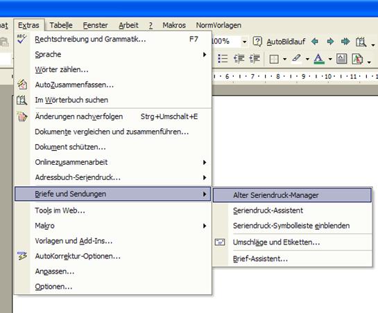 Abbildung 115, Der alte Seriendruck-Manager wird ins Menü Extras - Briefe und Sendungen eingefügt