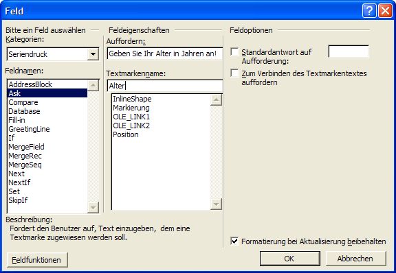 Mit einem Ask-Feld wird eine Abfrage des Anwenders durchgeführt. Die Antwort wird in einer Textmarke gespeichert, die von der Ask-Funktion erzeugt wird. Der Name dieser Textmarke muss der Ask-Funktion mitgeteilt werden.