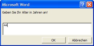 Wird jedoch die Position markiert, an der das Ask-Feld eingefügt wurde und das Feld mit F9 aktiviert, so sehen Sie die Wirkung der Ask-Funktion: Es öffnet sich ein Dialogfeld, in das der Anwender seine Antwort eingeben soll. (Abbildung 112)