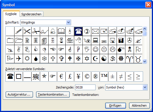 Das Telefonsymbol ( finden Sie unter Einfügen – Symbol in der Schriftart Wingdings.