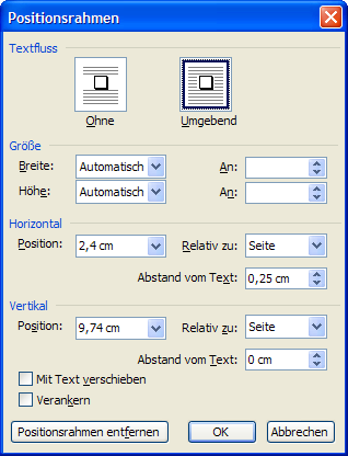 Legen Sie für die Formatierung des Positionsrahmens für