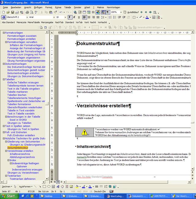 WORD bietet die Möglichkeit, links neben dem Dokument eine Art Inhaltsverzeichnis einzublenden, die sog. Dokumentstruktur.