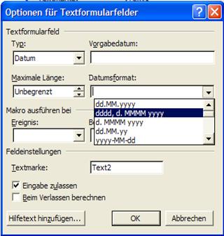 Sie können einem Formularfeld ein Makro zuordnen. Damit können beispielsweise je nach Eingabe in einem anderen Feld unterschiedliche Berechnungen durchgeführt werden. Der Makro kann wahlweise beim Eintritt oder beim Verlassen des Formularfeldes gestartet werden. |