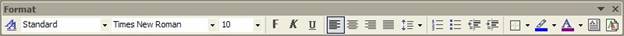 Für die Formatierung stehen die gebräuchlichsten Befehle auf der Format-Symbolleiste zur Verfügung. Sie sollte daher sinnvollerweise immer eingeblendet sein (Ansicht – Symbolleisten – Format).