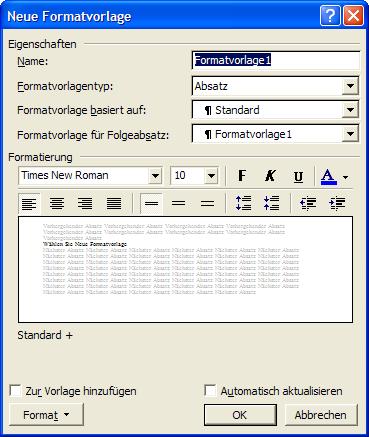 · Im Listenfeld Formatvorlage basiert auf: können Sie vorgeben, auf welcher anderen Vorlage Sie Ihre Vorlage aufbauen wollen. Sie müssen dann nur noch die Abweichungen von dieser Vorlage definieren.