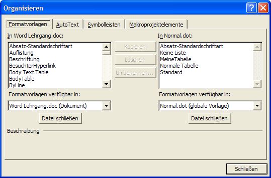 Dieses Dialogfeld listet in den beiden Listenfeldern alle Formatvorlagen von zwei Dokumenten auf (im Beispiel links WORD Lehrgang.doc und rechts Normal.dot).