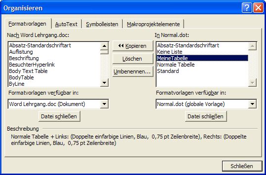 Ein Klick auf die Schaltfläche Kopieren würde im Beispiel Abbildung 62 die Formatvorlage MeineTabelle aus der Normal.dot in das Dokument WORD Lehrgang.doc kopieren.
