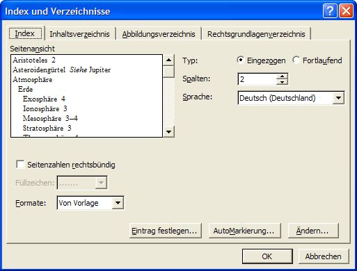 Abbildung 91, Dialog zum Erstellen eines Indexverzeichnisses