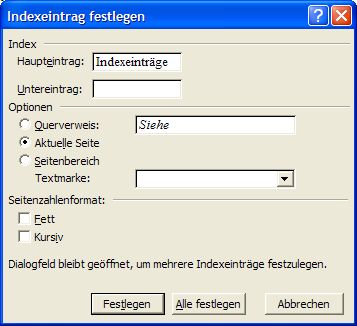Standardmäßig wird bei einem Index die Seite notiert, an der der Index im Text erscheint.