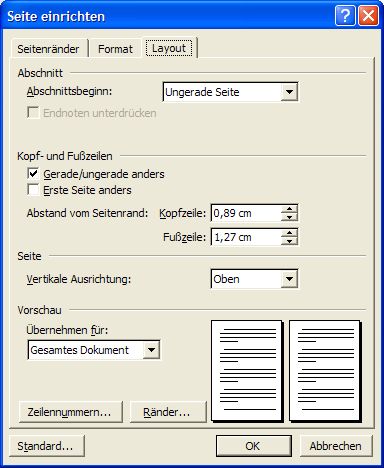 Der Abstand für Kopf- und Fußzeilen ist immer der Minimalabstand, der auch bei mehrzeiligen Kopf- und Fußzeilen eingehalten wird. |