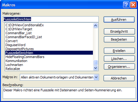 Achten Sie darauf, dass das richtige Dokument aktiviert ist. Makros, die noch nicht ausgetestet sind, können u.U. Ihr Dokument zerstören! |
