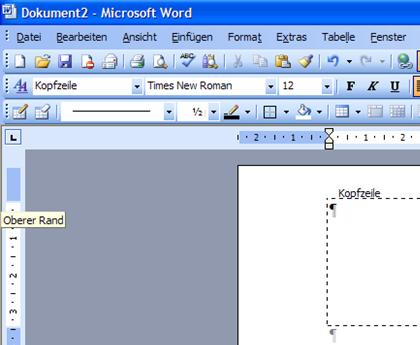 Falls Sie ein Firmenlogo in die Kopfzeile stellen wollen, wählen Sie den oberen Rand zu 45mm (Form B nach DIN 676). Stellen Sie die obere Begrenzung des Briefkopfes ein, indem Sie mit der Maus die Markierung im Vertikalen Lineal ziehen (am linken Rand von Abbildung 65)! |