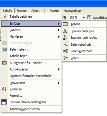 Wählen Sie Tabelle – einfügen… und definieren dann im Untermenü (s. Abbildung 74), welches Element Sie wo einfügen wollen.