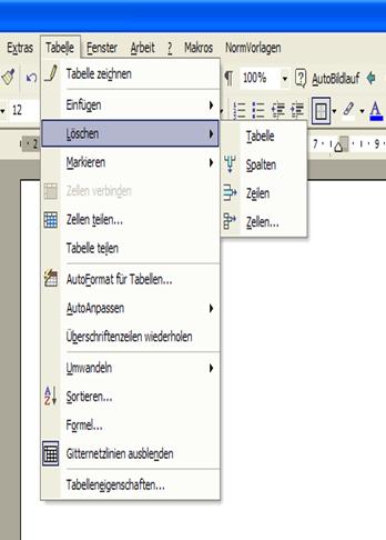 Wollen Sie jedoch Tabellenelemente (samt Inhalt) löschen, so wählen Sie Tabelle – Löschen – und dann entweder Tabelle, Spalten, Zeilen oder Zellen…