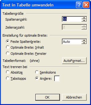 Markieren Sie den Text und wählen Tabelle – Umwandeln –Text in Tabelle…