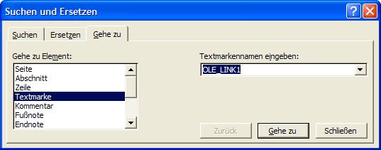 Wählen Sie im Listenfeld Textmarkenname eingeben einen Textmarkennamen aus und klicken auf die Schaltfläche Gehe zu.