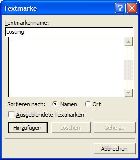 · Geben Sie im Textfeld Textmarkenname einen Namen für Ihre Textmarke ein und klicken auf Hinzufügen.