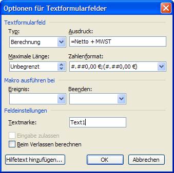 Textmarkennamen Netto und MWST vorliegen. Die Textmarken