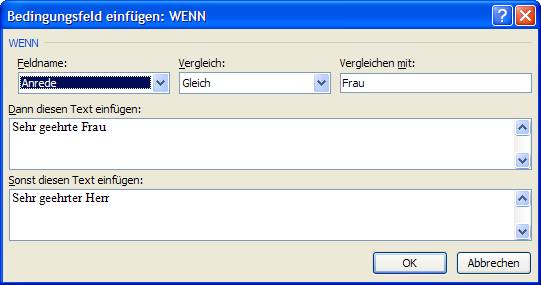 Die Logik dieser Eingabe kann man unmittelbar ablesen: Wenn der Inhalt des Feldes Anrede gleich „Frau“, dann einfügen Sehr geehrte Frau, sonst Sehr geehrter Herr.