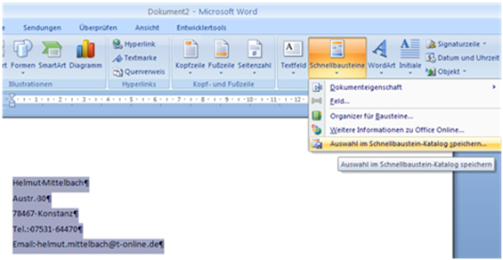 · Wählen Sie Register Einfügen, Gruppe text – Schnellbausteine – Auswahl im Schnellbaustein-Katalog speichern.