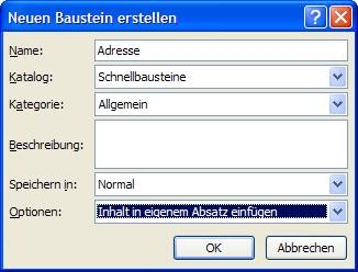 Abbildung 43, Dialog zum Erstellen von Schnellbausteinen