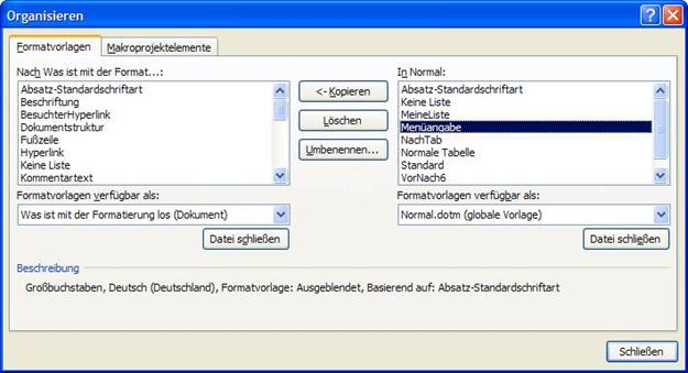 Ein Klick auf die Schaltfläche Kopieren würde im Beispiel Abbildung 59 die Formatvorlage Menüangabe aus der Normal.dotm in das Dokument Was ist mit der Formatierung los.doc kopieren.