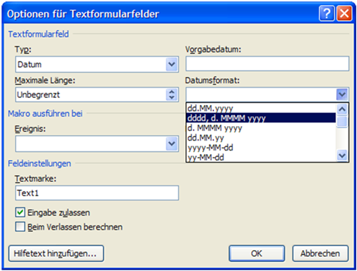 Wird, wie im Beispiel Abbildung 119, der Typ Datum ausgewählt, so lässt sich in einem weiteren Schritt das Datumsformat vorgeben.