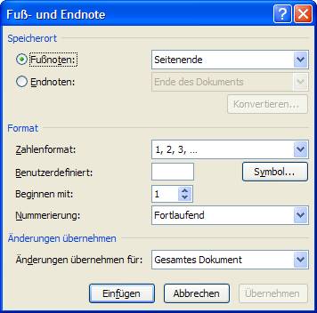 Abbildung 75, Dialog zur Definition von Fuß- und Endnoten