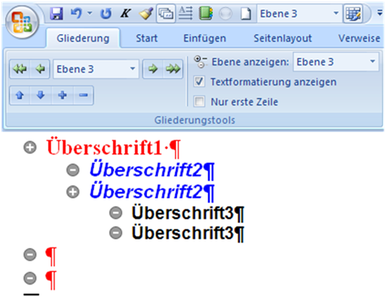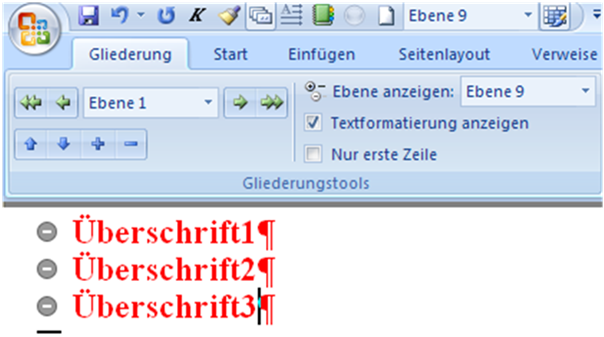 · Bis zu 9 Ebenen können auf diese Weise mit den Formatvorlagen Überschrift 1 bis Überschrift 9 versehen werden.