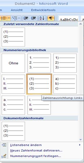 Die Nummerierung ist nun eingeschaltet und bleibt auch bei Absatzschaltungen im nummerierten Absatz aktiv, bis Sie sie durch einen Klick auf das Symbol Nummerierung wieder ausschalten. Das Format der Nummerierung bestimmen Sie, indem Sie auf den kleinen blauen Pfeil rechts neben dem Symbol Nummerierung klicken und ein Zahlenformat aus der Bibliothek auswählen.