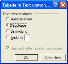 WORD wandelt mit dem Befehl Register Tabellen-Tools – Layout, Gruppe Daten – in Text konvertieren… eine markierte Tabelle in Fließtext um.