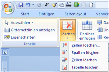 Wollen Sie jedoch Tabellenelemente (samt Inhalt) löschen, so wählen Sie Register Tabellen-Tools, Gruppe Zeilen und Spalten - Löschen– und dann entweder Zellen, Spalten, Zeilen oder Tabelle …