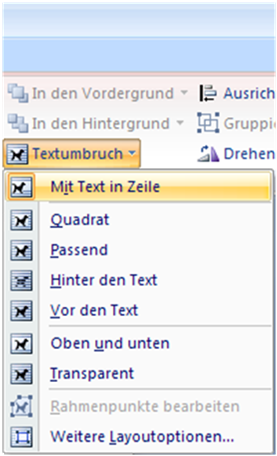 · Der Befehl Mit Text in Zeile behandelt die Grafik wie ein Schriftzeichen in der Zeile (Typ: InlineShape). Damit ist sie nicht frei positionierbar, sondern lässt sich nur innerhalb des Textes und mit dem Text verschieben. Die Höhe der Grafik bestimmt die Zeilenhöhe.